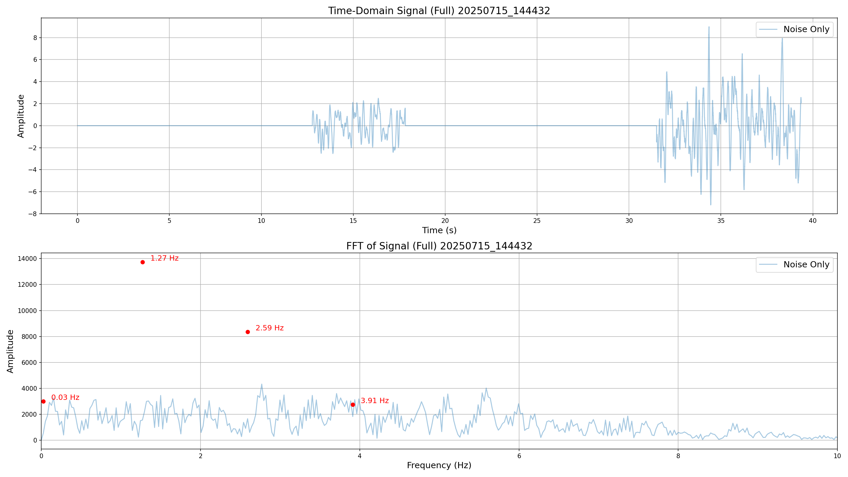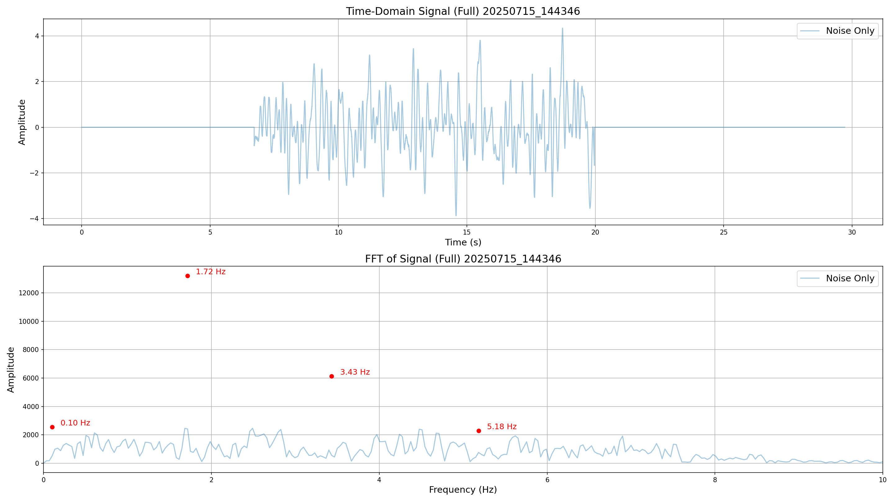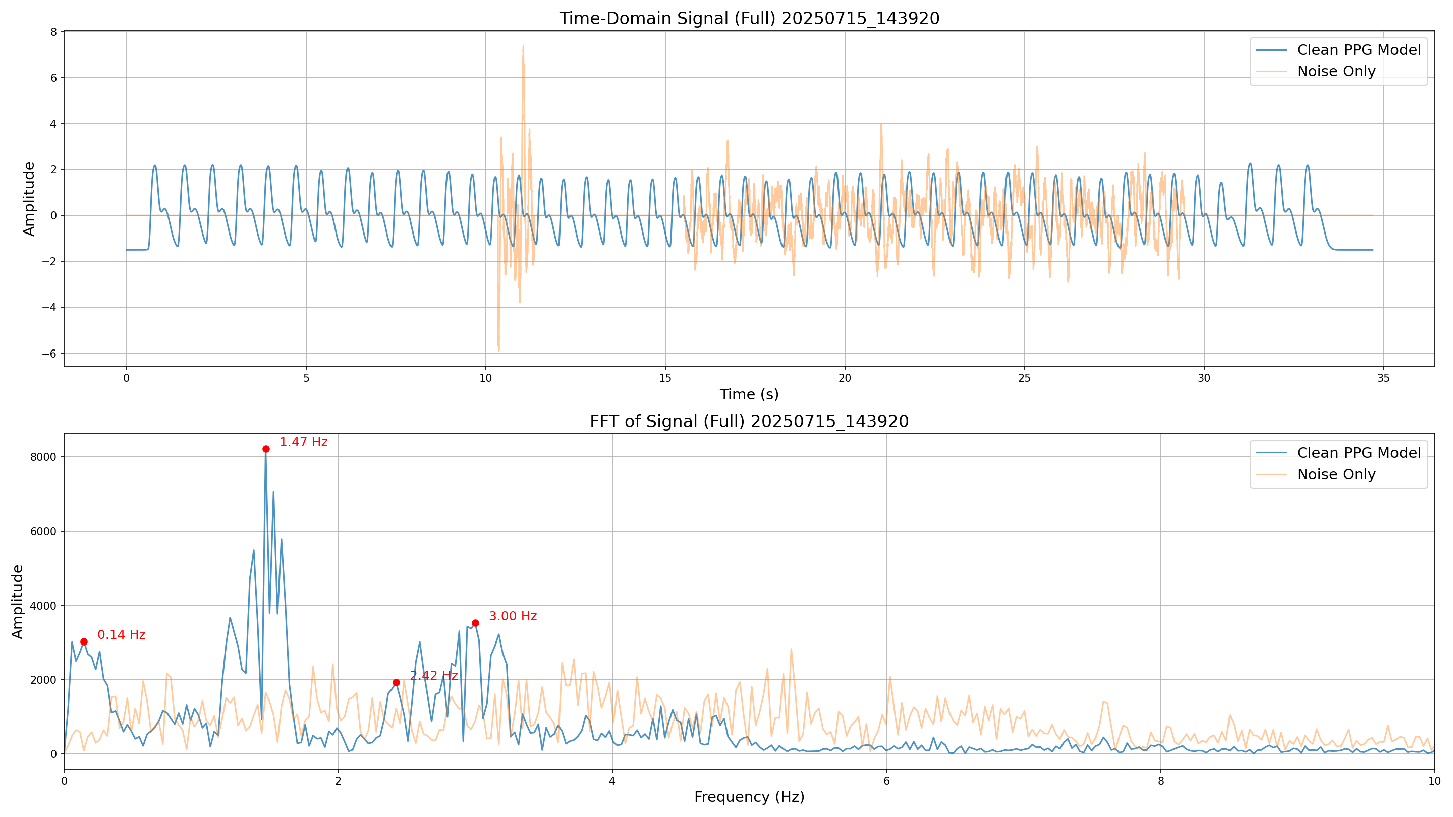 The following metrics illustrate the time-domain and frequency-domain characteristics of the generated signals under various noise conditions.
