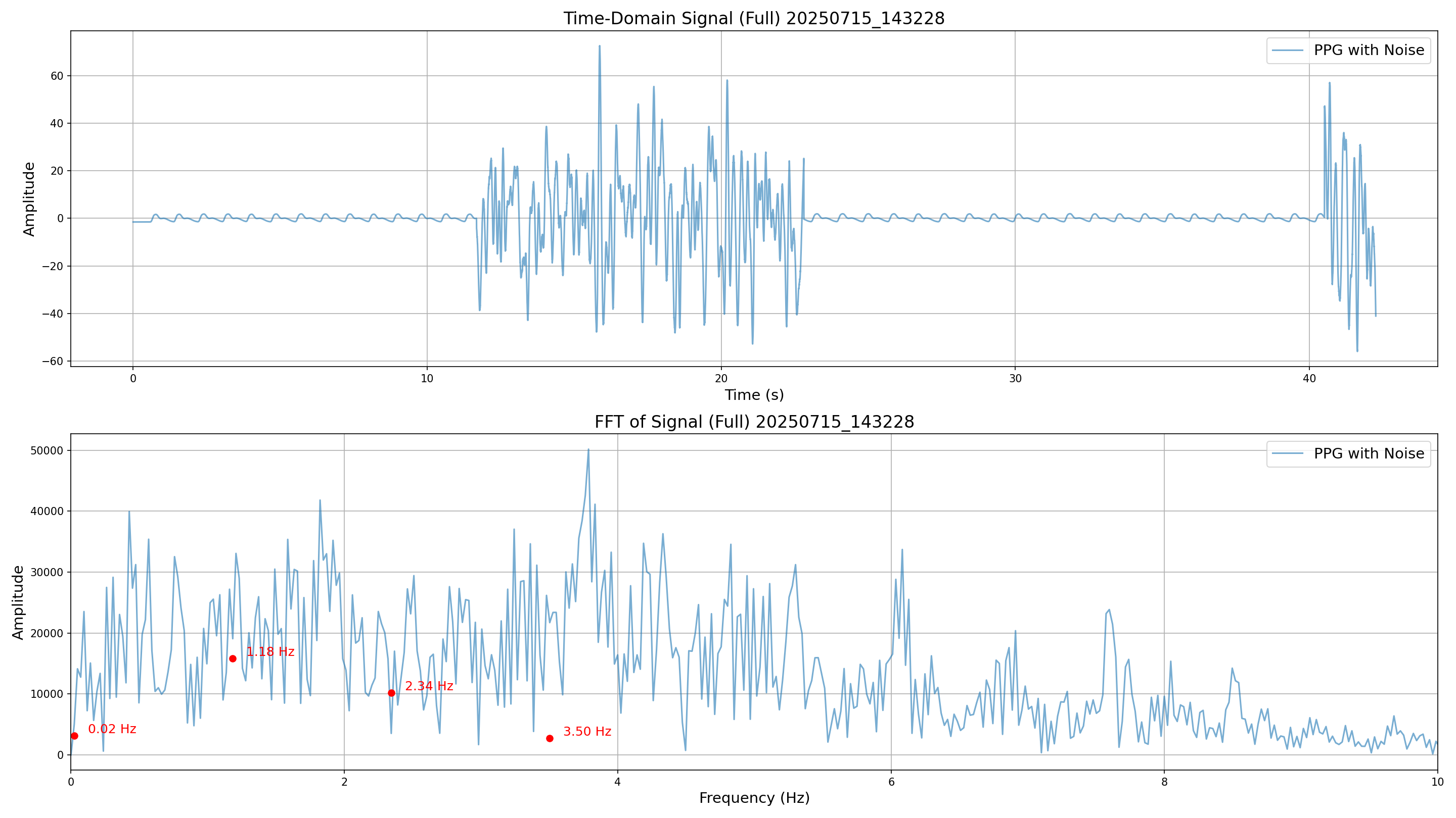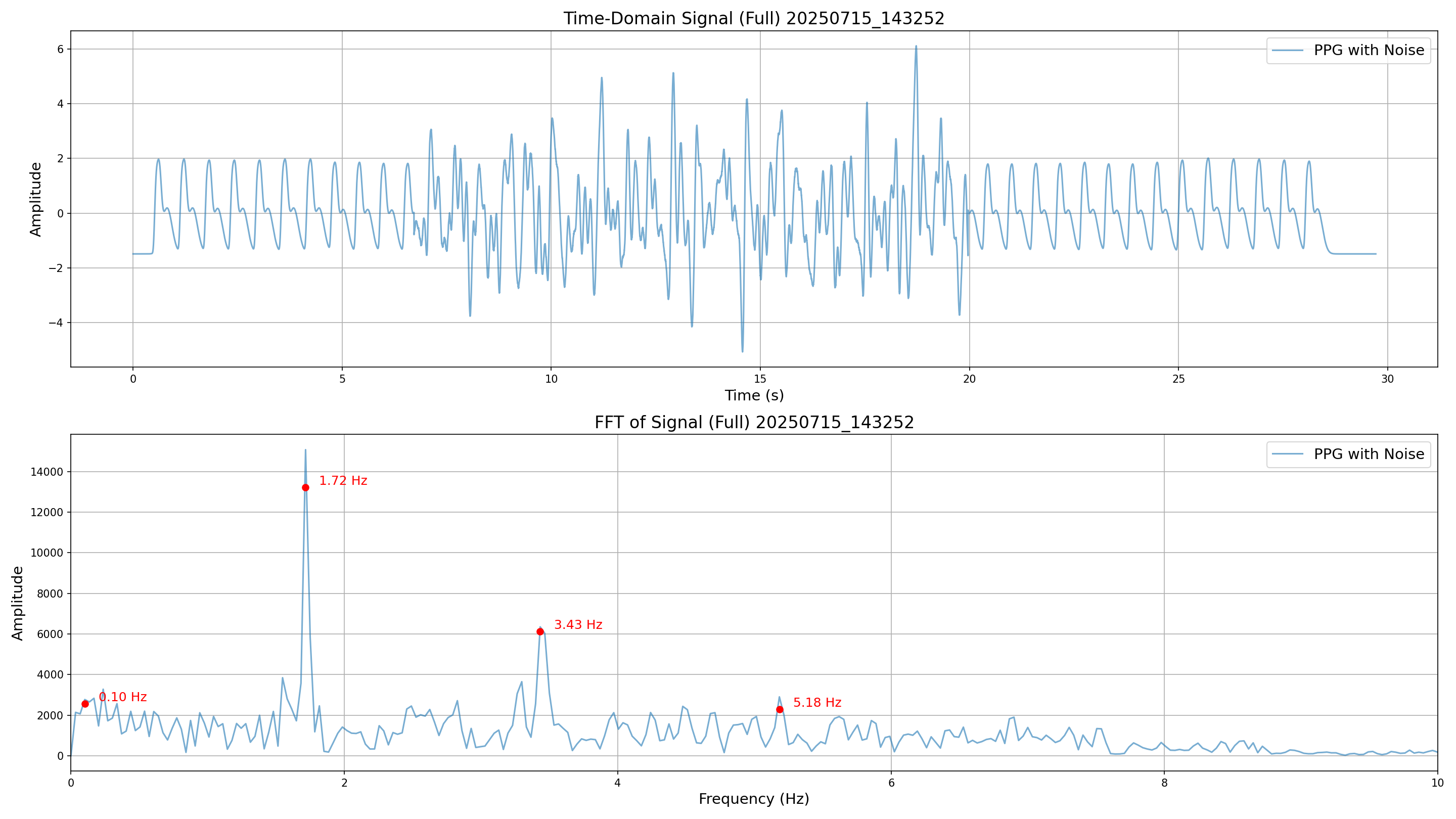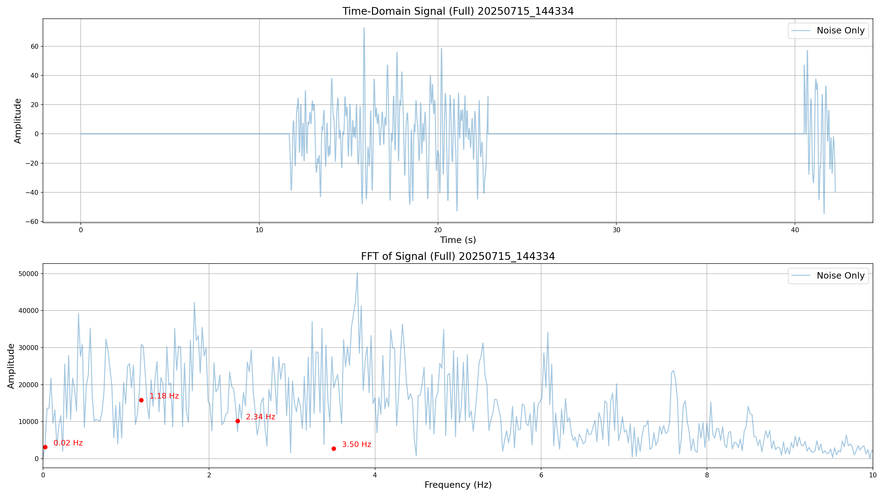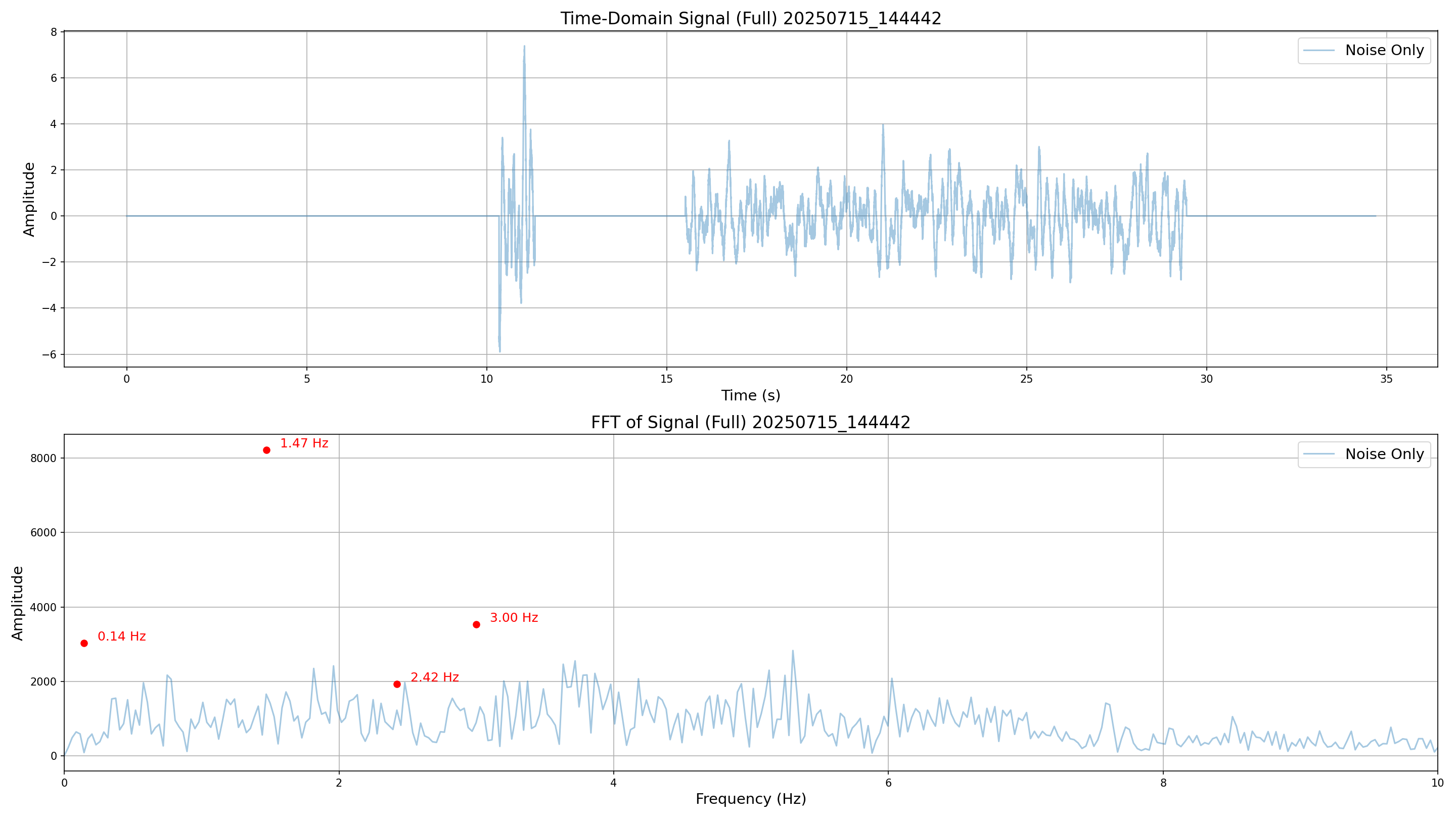 The following metrics illustrate the time-domain and frequency-domain characteristics of the generated signals under various noise conditions.